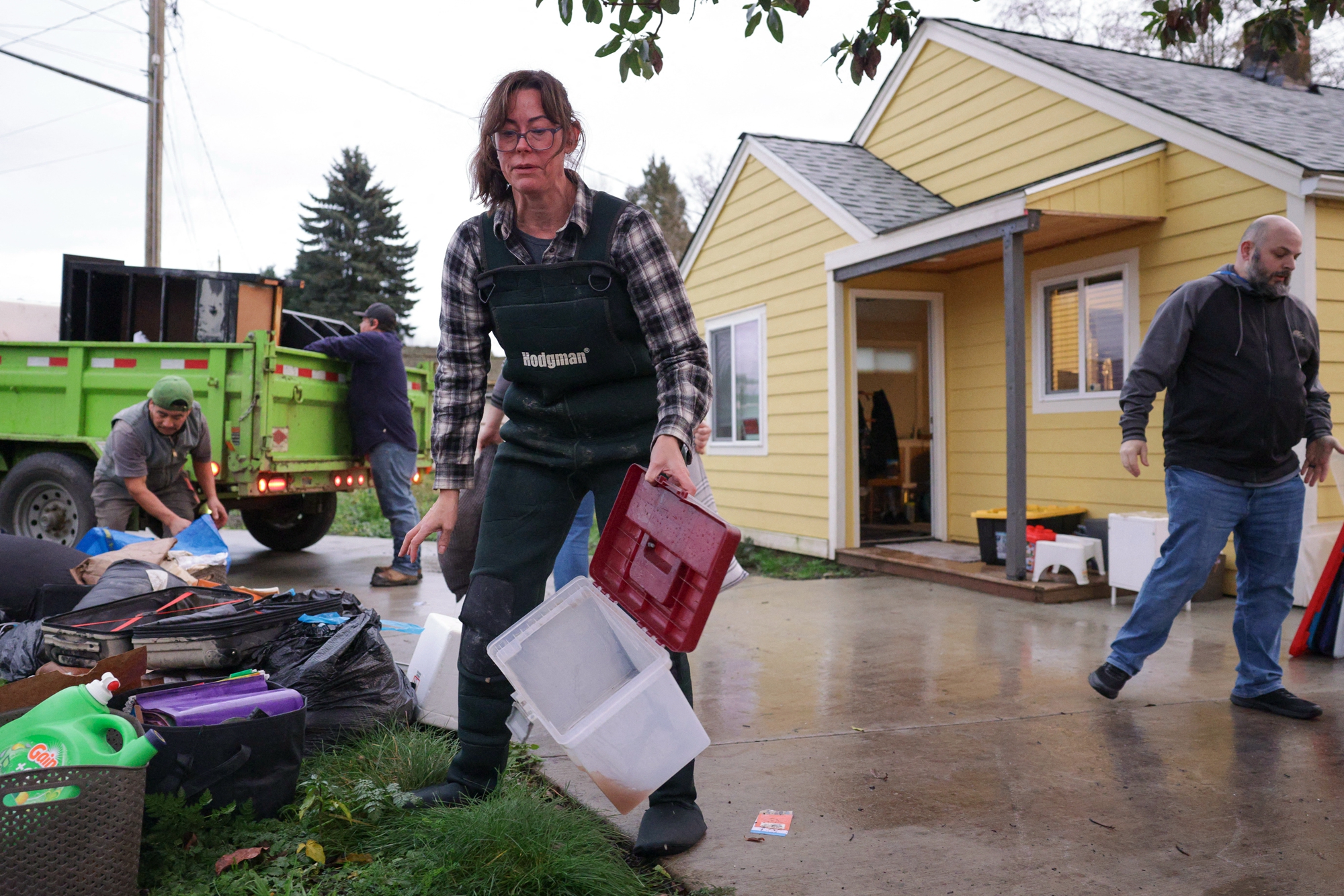 2025年12月12日,华盛顿州世德罗-伍利市(Sedro-Woolley)境内的斯卡吉特河泛滥成灾,雷切尔‧波普科夫(Rachel Popkov)的住宅被水淹,她被迫扔掉受损的物品。(Jason Redmond/AFP via Getty Images)