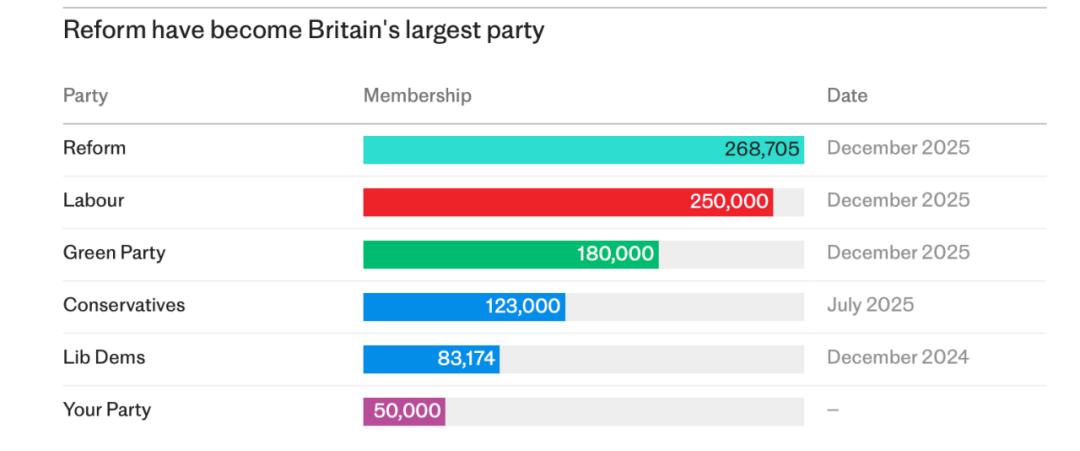 《每日电讯报》12月12日消息:最新数据显示,截至2025年12月份,英国改革党的成员人数达到约26.9万,首次超过工党(不足25万),成为英国最大的政党。
