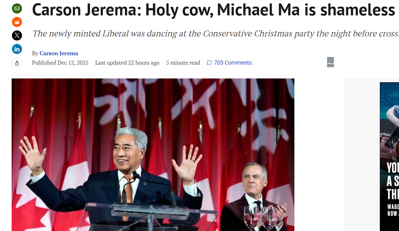 马荣铮(Michael Ma)从保守党倒戈加入自由党的行为之无耻,几乎到了令人“肃然起敬”的程度。马荣铮并不存在任何良心上的挣扎,也没有来自选民的强烈呼声要求他协助总理卡尼争取多数政府,更没有与保守党领袖博励治之间的明显矛盾。事实上,看不出他有任何理由——更不用说站得住脚的理由——来解释这位仅在不到八个月前刚刚当选的新人国会议员,为什么需要更换党派。