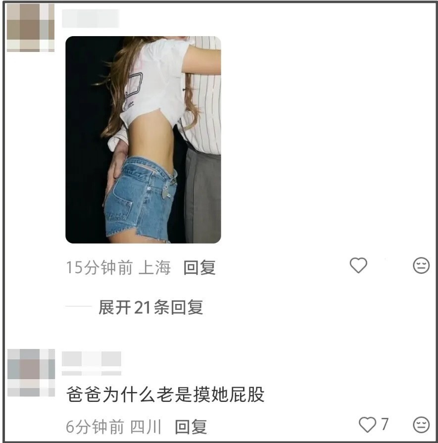 在一些网友的想法里,按她继父的身高,明明可以把手放在她腰间,非要放在臀部,这就是逾距了。