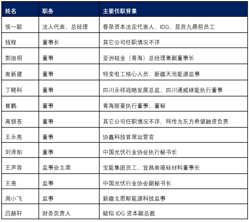 第二,此前有知情人向赶碳号透露,光和谦成法人代表、总经理侯一聪,即是光伏协会推荐的。我们前不久报道过,侯一聪,现任春泉资本法人代表,曾任职于IDG资本投资顾问(北京)有限公司,担任大项目投后负责人兼金融科技行业高级投资经理,后曾任昆吾九鼎投资管理有限公司投资总监。