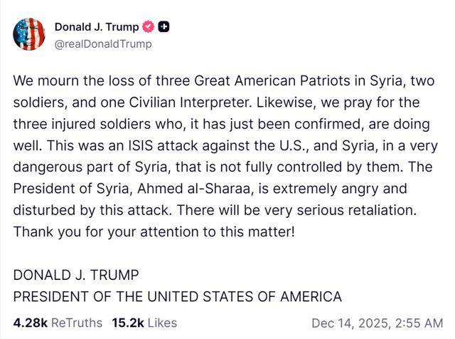 川普当天在社交媒体上发文称,这是“IS在叙利亚一个非常危险的地区对美国和叙利亚发动的袭击”。他警告说,“将会有非常严厉的报复”,并补充称,叙利亚政权领导人艾哈迈德·沙拉对这次袭击“感到极其愤怒和不安”。