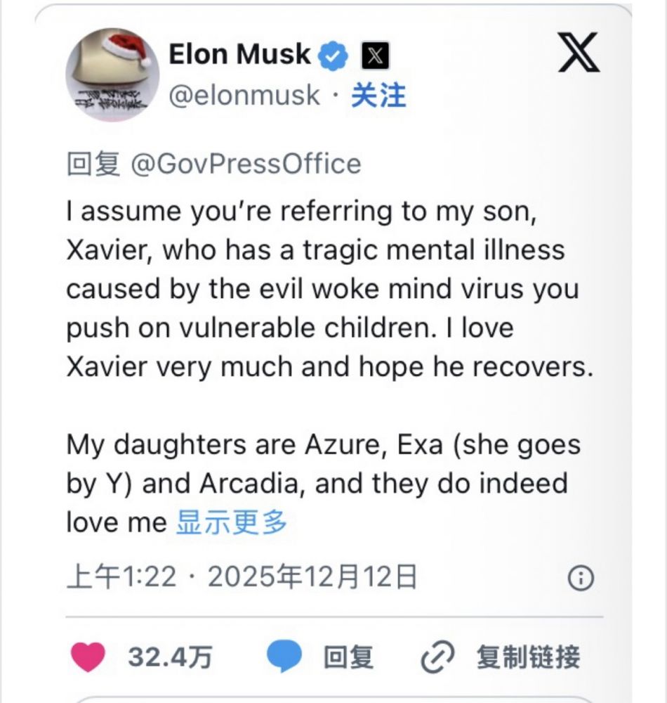 “你指的想必是我儿子泽维尔——正是你们强加给脆弱儿童的邪恶觉醒病毒,导致他罹患悲惨的精神疾病,”马斯克犀利回击,“我无比爱泽维尔,祈愿他早日康复。”