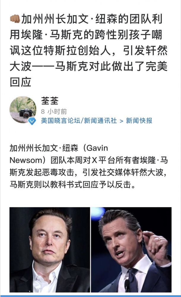 纽森的新闻团队2025年12月11日周四更变本加厉,竟以马斯克的跨性别子女泽维尔(Xavier)为靶子,对特斯拉创始人发动恶毒攻击。
