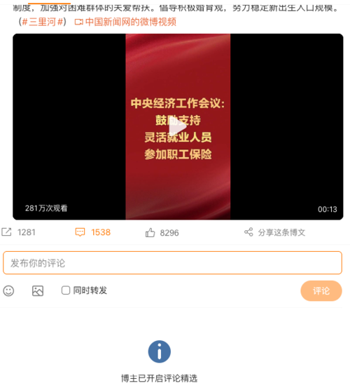 中国新闻网官方微博报道上述内容后,大量网友涌入留言,以至其开启评论精选。