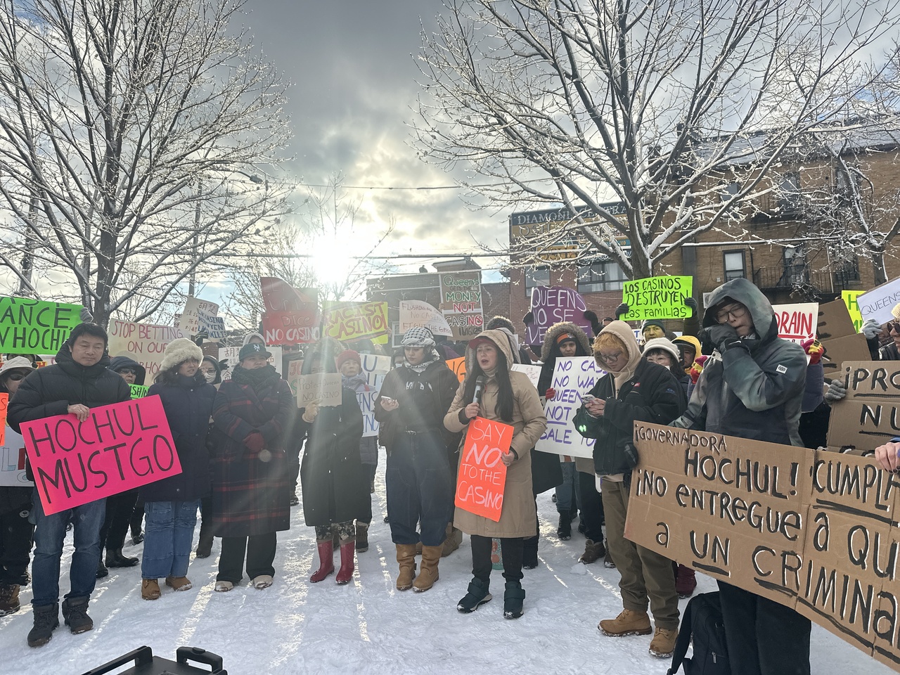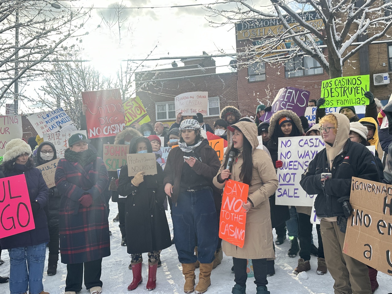 纽约州赌场设址委员会(Gaming Facility Location Board)日前建议核发三张下州赌场牌照,州博彩委员会将于15日召开会议,预计会后将发布牌照的最终裁决结果,皇后区部分居民14日冒雪聚集可乐娜再抗议,呼吁委员会否决邻近法拉盛的花旗球场(City Field)周边的大都会公园(Metropolitan Park)赌场建案,表示这将对包括法拉盛在内的邻近社区都造成重大伤害,多个社区届时恐面临迫迁与租金上涨等冲击。