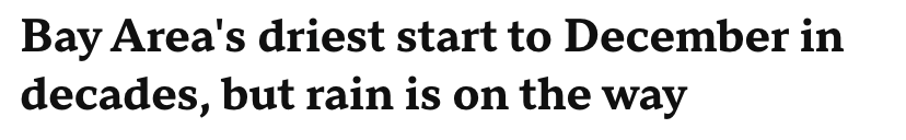 对于旧金山湾区大部分地区而言,今年 12 月至今滴雨未降,许多地点经历了数十年来最干旱的12月初。