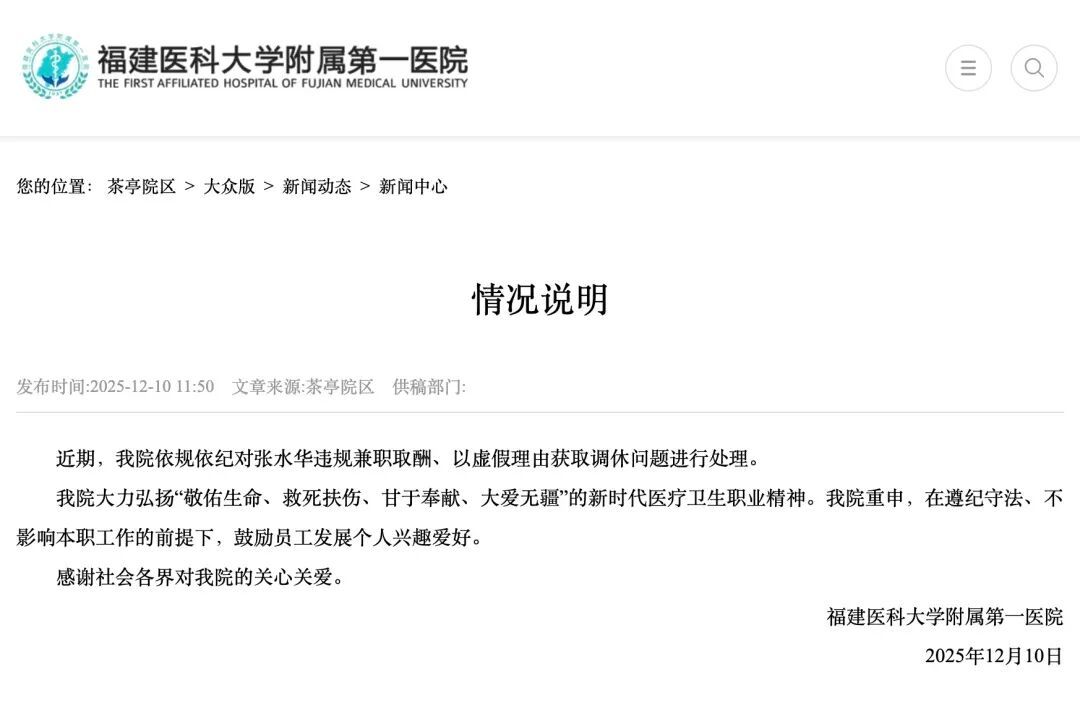 12月10日,福建医科大学附属第一医院官网发布情况说明:近期,我院依规依纪对张水华违规兼职取酬、以虚假理由获取调醒淌题进行处理。根据此前在网络流传的《福建医科大学附属第一医院关于对张水华的处理决定》,张水华被医院给予警告处分,为期6个月,并且2025年度考核不能确定为优秀档次。