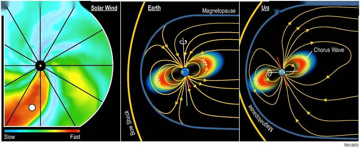 西南研究院(SwRI)的科学家们将 2019 年地球上发生的强烈太阳风暴(第二幅图)所引发的快速太阳风结构(第一幅图)的空间天气影响,与 1986 年旅行者 2 号探测器在天王星观测到的情况(第三幅图)进行了比较,以期解开困扰人们 39 年的关于极端辐射带的谜团。“合唱波”是一种电磁辐射,它可能会加速电子,而这种辐射可能正是由太阳风暴产生的。图源:西南研究院