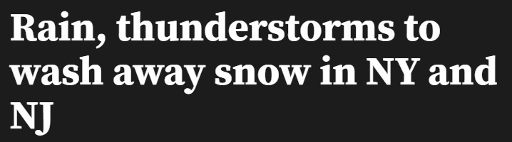 继上周末一场降雪袭击三州地区之后,一场新的风暴预计将在周五给纽约州和新泽西州带来降雨。据PIX11气象团队表示,此前暴雪留下的积雪将基本被雨水全部冲刷掉。