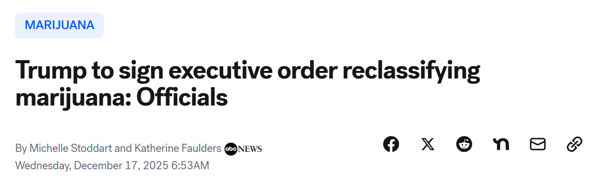 两名熟悉相关情况的高级政府官员透露,美国总统川普最早可能于12月17日周三签署一项行政命令,将大麻重新归类为“附表III”药物,此举将实质性放宽联邦层面对大麻的限制。