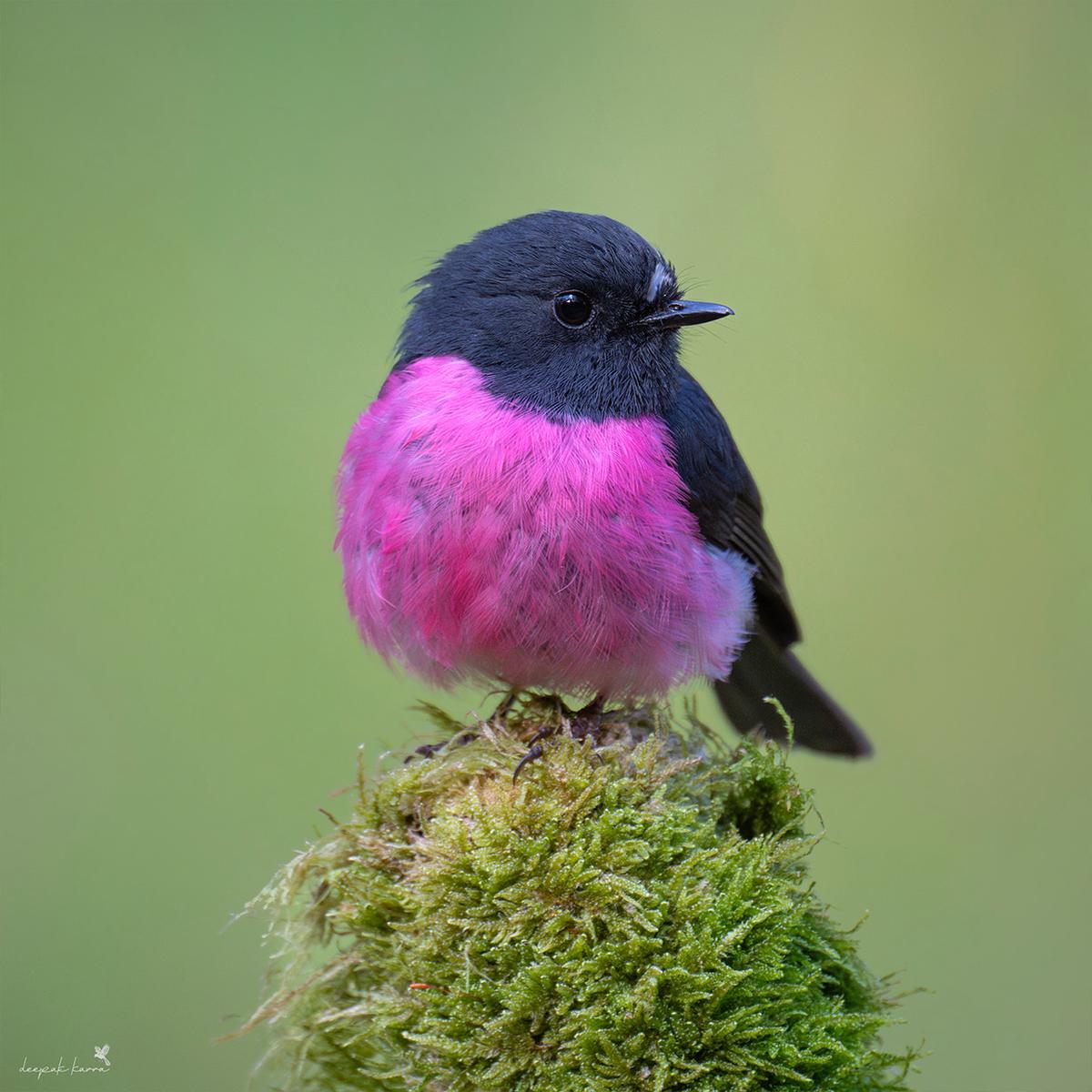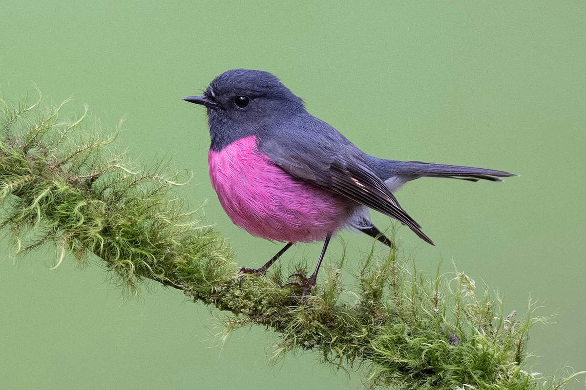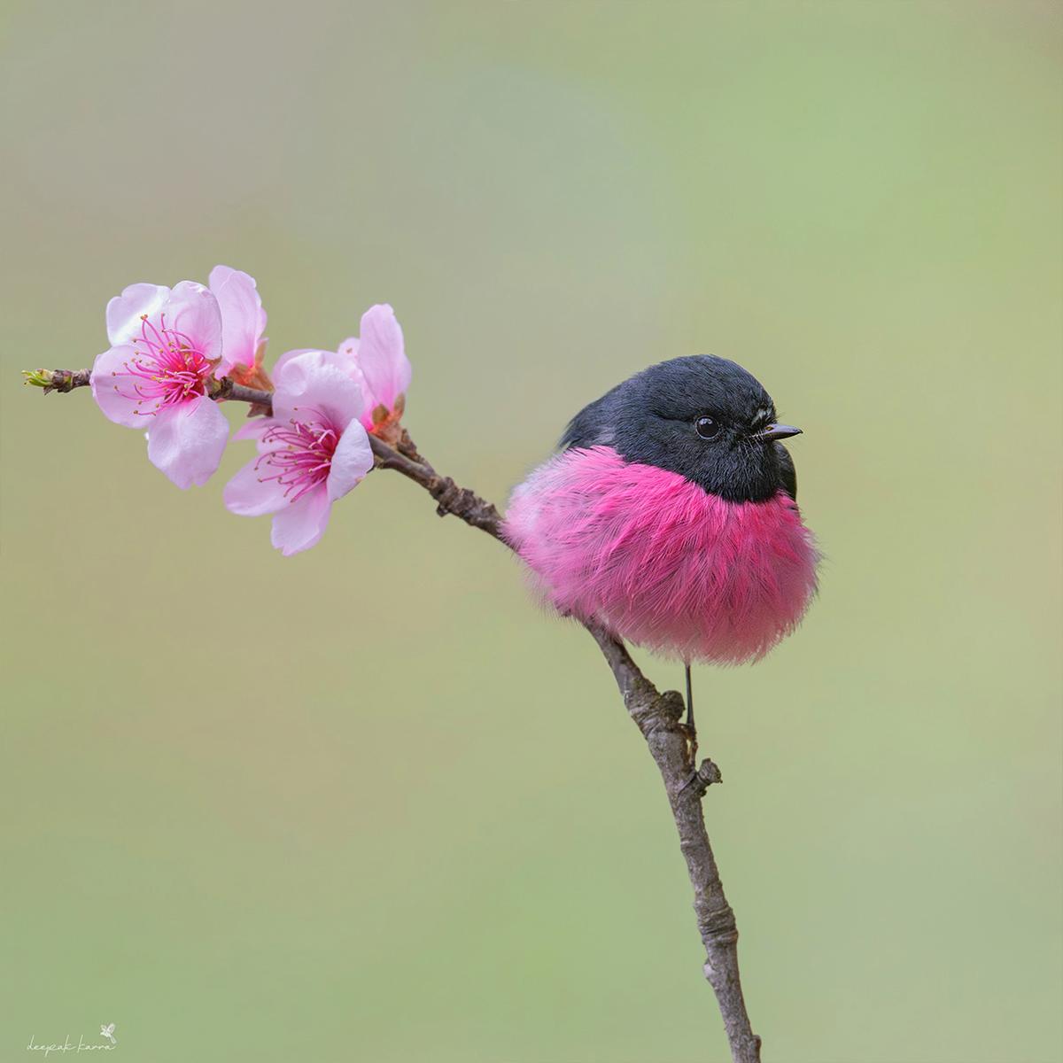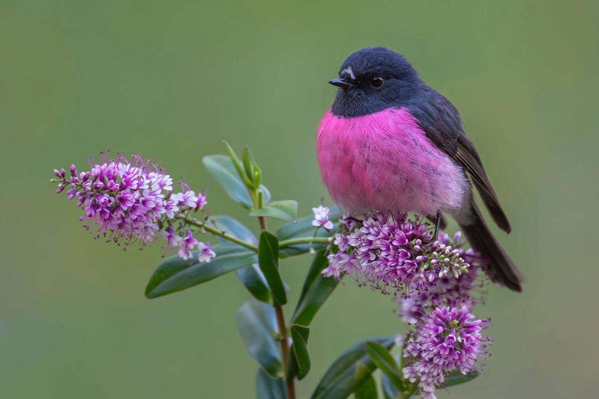 北美常见的知更鸟胸脯呈銹橙色,羽毛暗淡无光;而澳洲的维多利亚(Victoria)、新南威尔士州(NewSouthWales)和塔斯马尼亚州(Tasmania)特有的一种知更鸟,却有着鲜艳的粉红色胸脯。这种醒目的萤光粉与它光滑的黑色头部、尾部和背部羽毛形成鲜明对比。此外,它们蓬松的体型更添可爱。