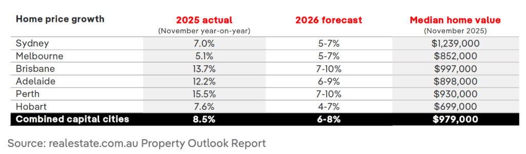 Flaherty称:“布里斯班与珀斯预计将成为2026年表现最佳的两大首府城市,房价涨幅预期居于首位。”