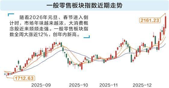 市场热点方面,随着2026年元旦、春节进入倒计时,市场年味越来越浓,大消费概念股近来频频走强。一般零售板块指数全周大涨近12%,创年内新高。百大集团7日6涨停,股价创10年来新高;利群股份4日3涨停,上海九百连续2日涨停,中央商场、永辉超市、茂业商业等近期也多次涨停。