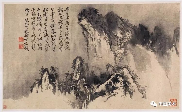 石涛善用墨法,枯湿浓淡兼施并用,尤其喜欢用湿笔,通过水墨的渗化和笔墨的融和,表现出山川的氤氲气象和深厚之态。有时用墨很浓重,墨气淋漓,空间感强。在技巧上他运笔灵活。或细笔勾勒,很少皴擦;或粗线勾斫,皴点并用。有时运笔酣畅流利,有时又多方拙之笔,方圆结合,秀拙相生。