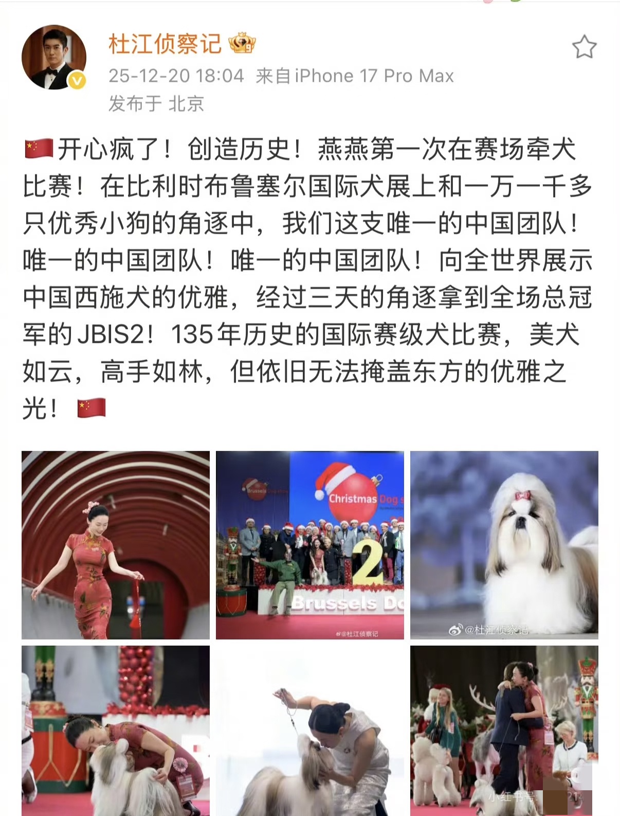 她带着自己狗狗霍香香参加国际比赛,狗狗是中国犬西施,在一万多只狗的角逐中,霍思燕是唯一的中国代表队,而且霍香香在三天的角逐比赛中拿下了总冠军。杜江在发文中体现了自豪之情。