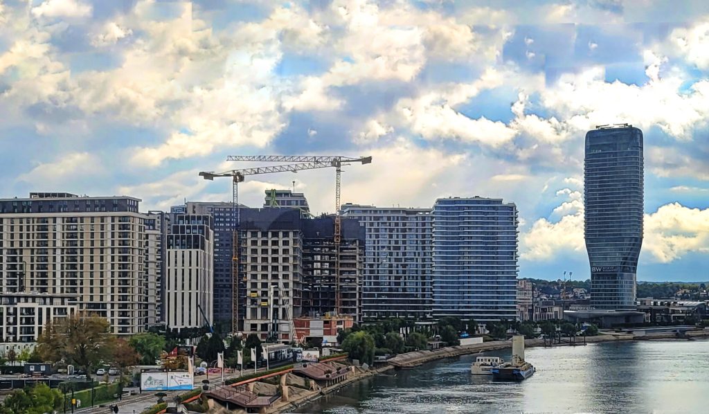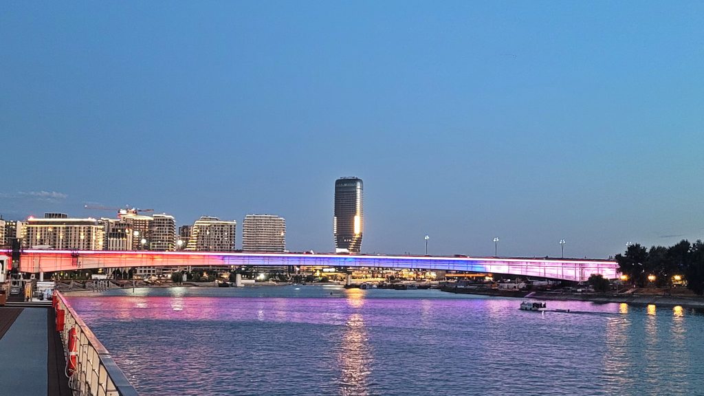 醒目且灯火通明的桥梁是布兰科桥,横跨萨瓦河。其间极具特色的摩天楼是贝尔格莱德最高建筑瑞吉酒店及公寓。