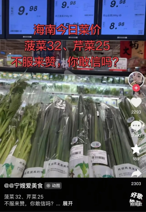 有网友晒出了海南封关后的菜价。菠菜要32元(人民币,下同)/斤,芹菜要25元/斤。还有网友表示他出门去买了一根油条,结果被收了7块钱。