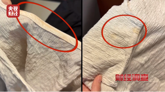记者根据线索,从“熙熙女装搭配”直播间仅花6元购得三件包邮的所谓“样衣尾货”。这些衣物乍看尚可,细看却破绽明显:白色上衣领口、腋下有黄渍和粉底印,黑色短裙裙摆沾有油渍,白色上衣下摆和腋下存在脱线问题,显然都是被穿用过的二手旧衣。