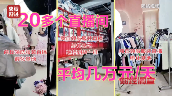 天和服饰老板告知记者,河南商丘直播基地是其最大客户,记者循线索前往调查。进入商丘领航直播基地,发现整层楼是大型二手衣物仓库,衣架挂满各式二手服装,角落堆着装满衣服的麻袋。