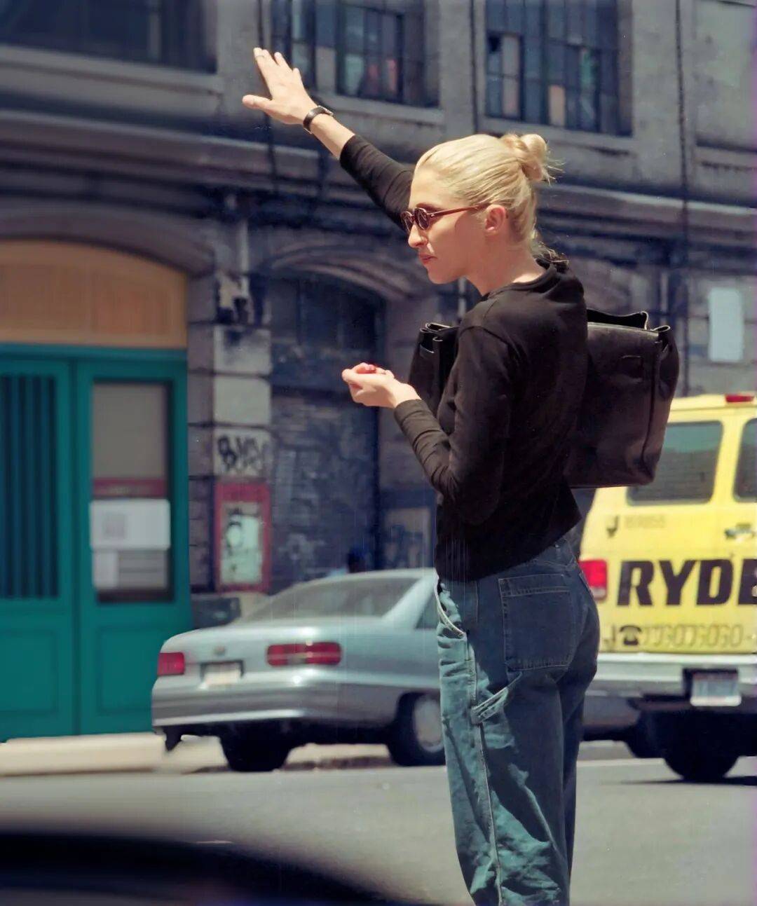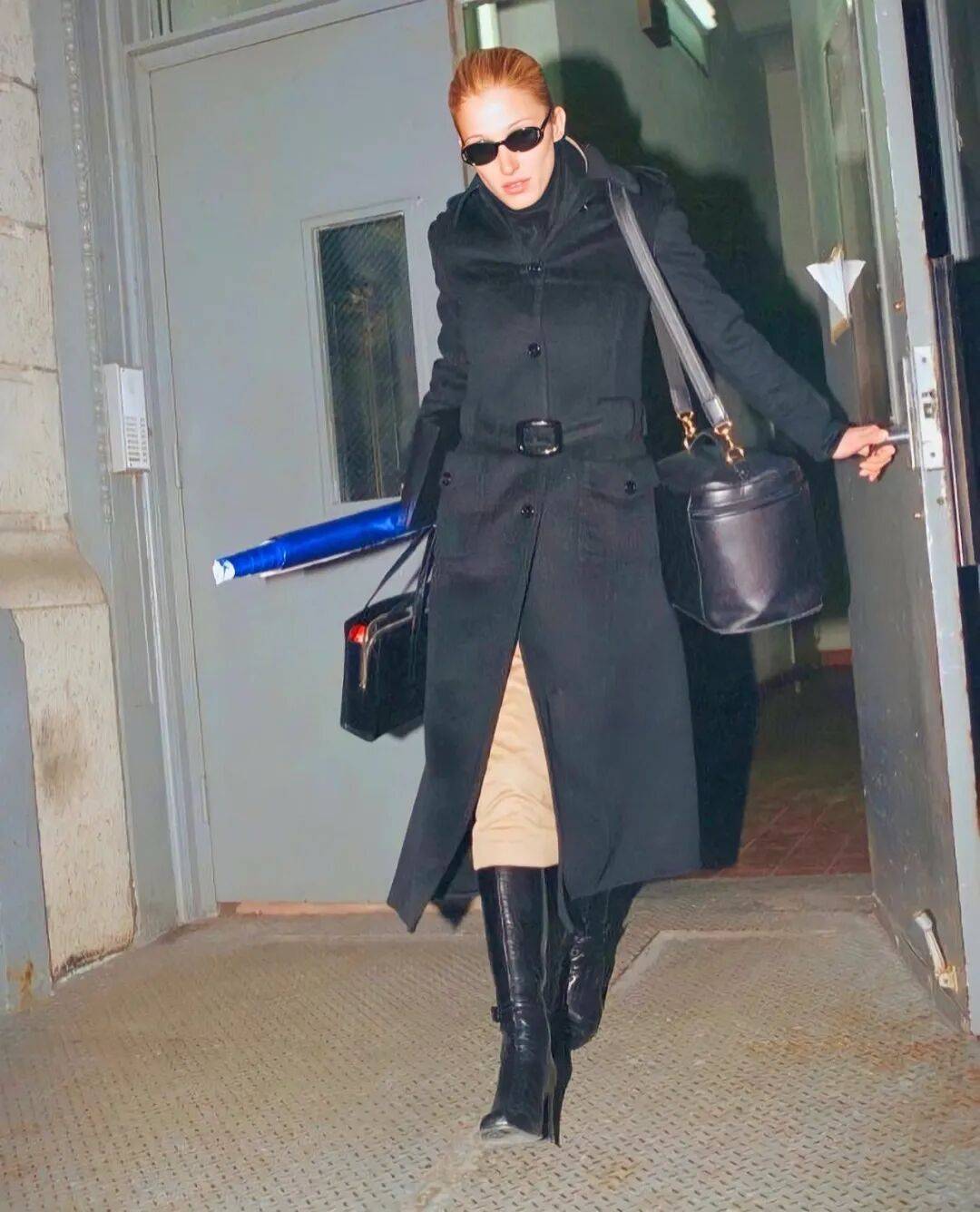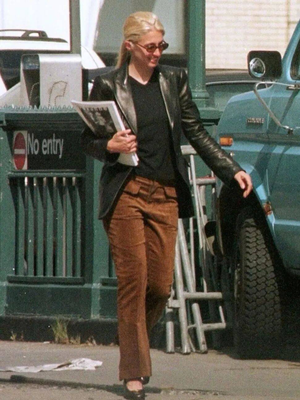 她的巧思远不止于此,同样经典的,还有她将日常配件化为高级装饰的智慧。她曾以一条彩色头巾束起金发,勾勒出鲜明的轮廓与复古韵味。