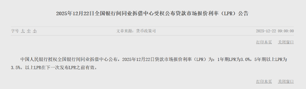 中国人民银行授权全国银行间同业拆借中心公布,2025年12月22日贷款市场报价利率(LPR)为:1年期LPR为3.0%,5年期以上LPR为3.5%。以上LPR在下一次发布LPR之前有效。