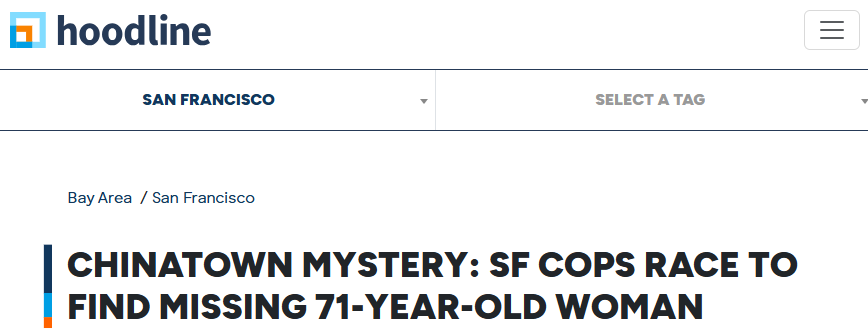 据报道,71岁的Eileen Hway于周五(12月19日)在旧金山唐人街附近失踪,至今下落不明。她最后一次被看到是在下午1:30左右,地点位于Washington和Stockton streets附近,旧金山警方呼吁公众协助寻找。