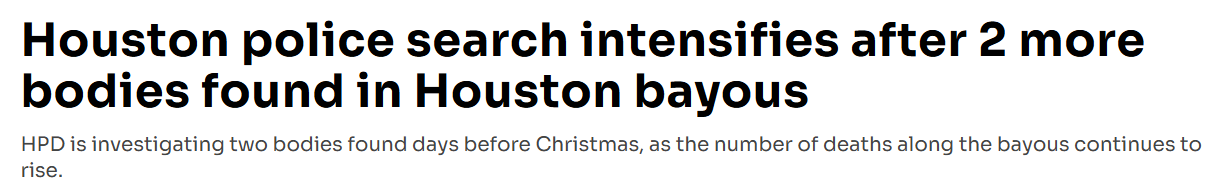 据12月22日报道,休斯敦河湾及周边地区近期发现的遗体数量持续上升,警方正在调查圣诞节前几天新发现的两起案件。