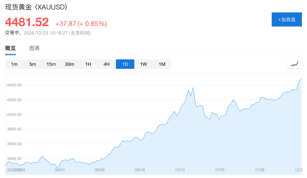 现货黄金再度刷新历史新高。在对美联储2026年进一步降息的预期以及委内瑞拉附近地缘紧张局势的推动下,现货黄金价格今日一度触及每盎司4486美元的历史新高,这是其年内逾50次创下纪录。