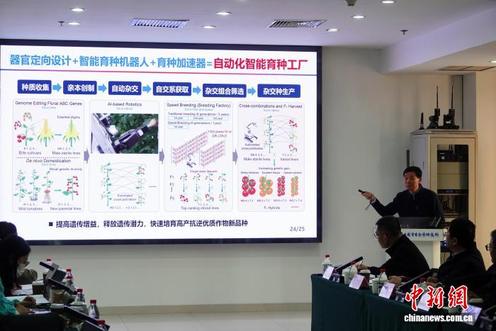 发布会上,李家洋院士介绍种子专项整体实施情况,展望未来的自动化智能育种工厂。中新网记者孙自法摄