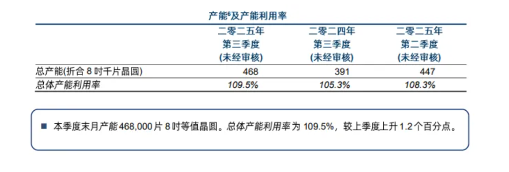 华虹公司第三季度总体产能利用率为109.5%,较上季度上升1.2个百分点。