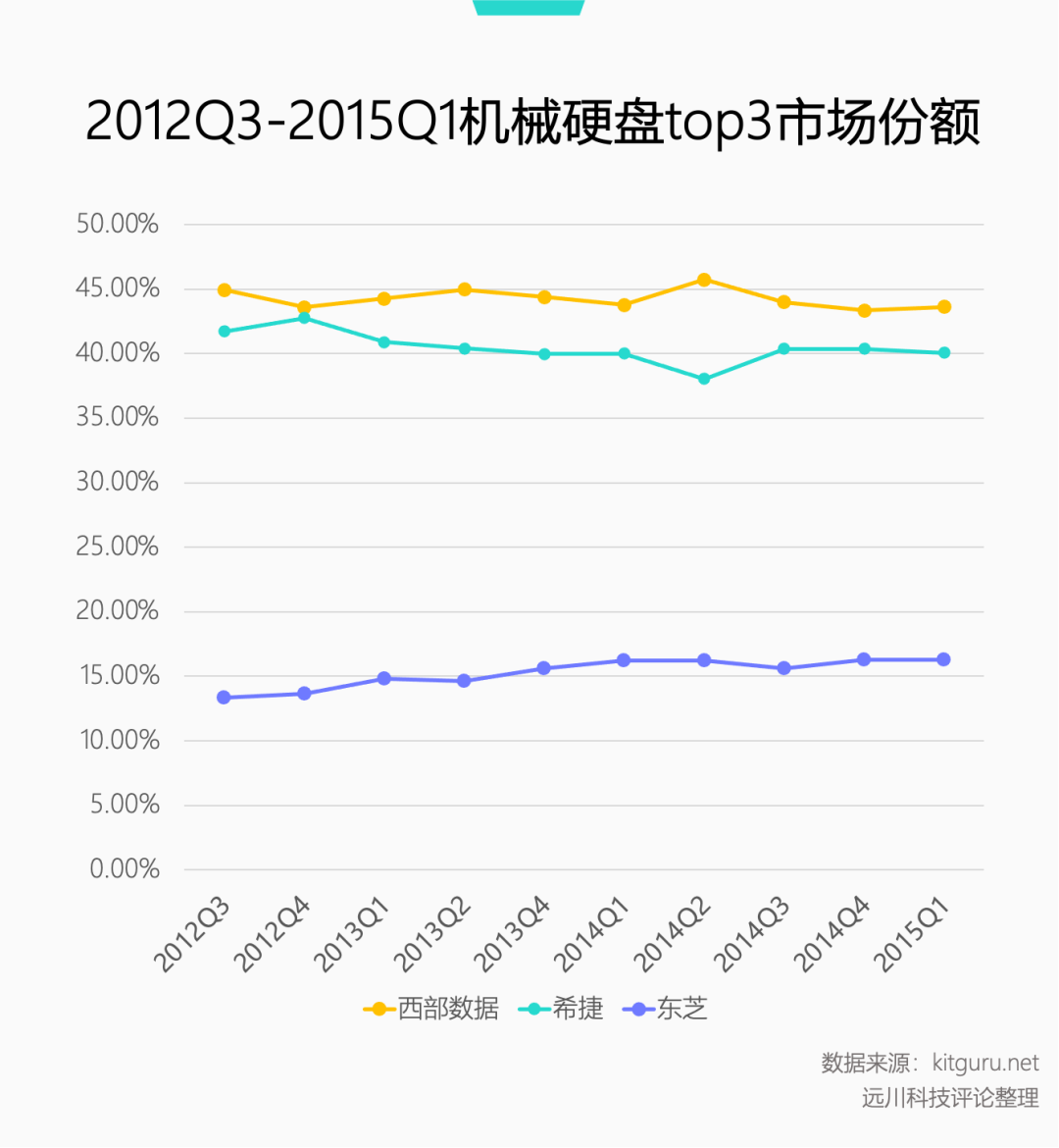 2012年左右,机械硬盘出货量达到顶峰,西部数据和希捷创下销量记录,前者收购了日立硬盘业务,后者收购了三星硬盘业务,两家合计份额将近90%,加上老三东芝,一副天下大定的态势。