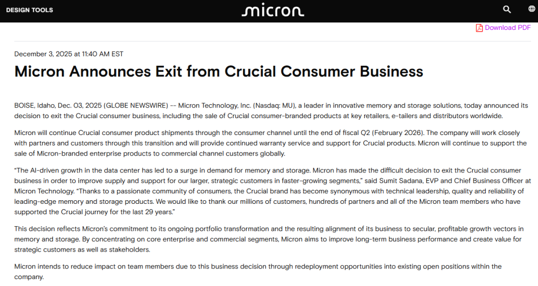 无独有偶,本月月初,另一家内存大厂美光宣布关停旗下消费级存储品牌英睿达(Crucial),彻底退出消费级存储业务。