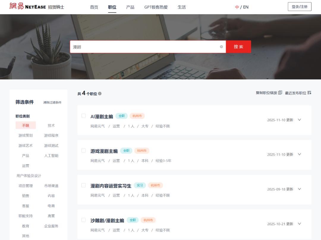 而网易主要招聘的岗位主要集中于内容创作方面,岗位包括AI漫剧主编、游戏漫剧主编、沙雕漫主编等。
