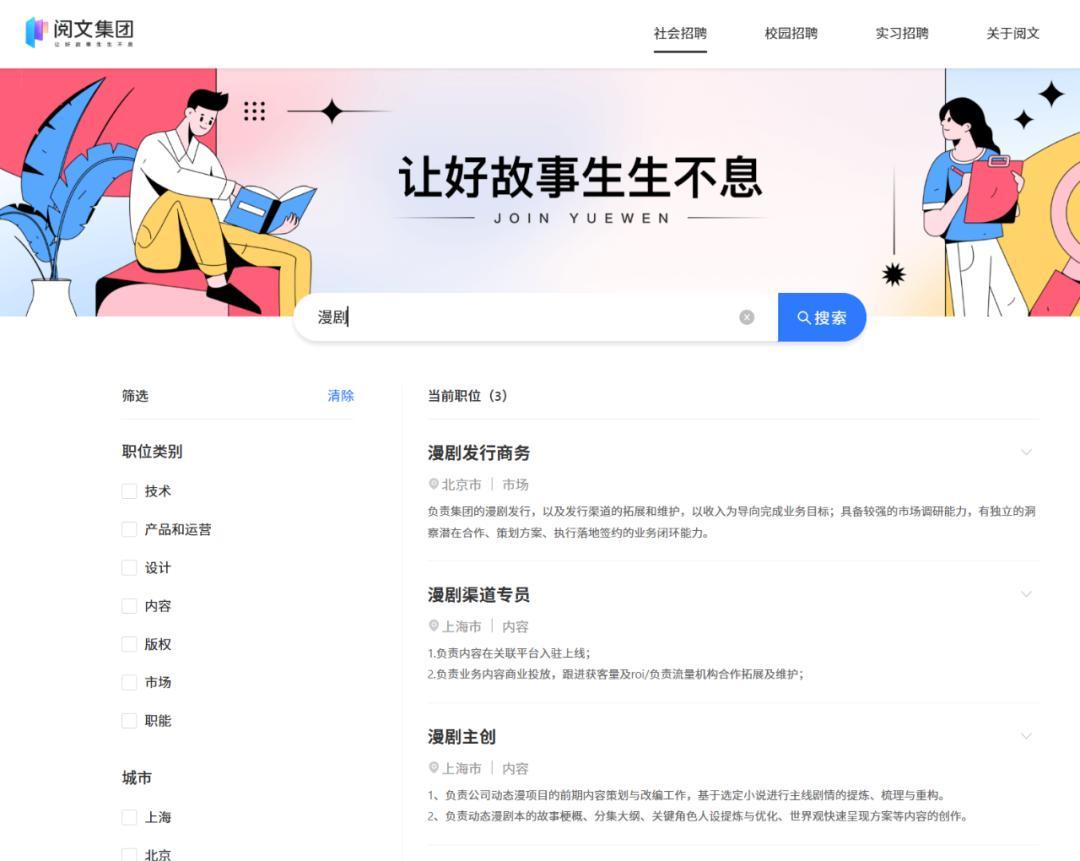 从目前已经发布了的动漫政策来看,除了七猫、书旗、知乎、红果等企业均有进行漫剧相关的岗位招聘外,阅文、网易、字节跳动等头部互联网公司也在进行招兵买马。