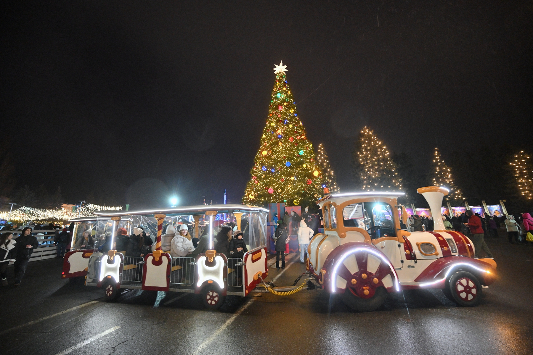 2025年12月21日,在基辅乌克兰国家展览中心举行的圣诞博览会上,一家人在旋转木马旁拍摄全家福。(Sergei Supinsky/AFP via Getty Images)2025年12月21日,在基辅乌克兰国家展览中心举行的圣诞博览会上,一列火车载着游客前行。(Sergei Supinsky/AFP via Getty Images)2025年12月13日,人们走在乌克兰南部城市扎波罗热(Zaporizhzhia)装饰有圣诞彩灯的街道上。(Darya Nazarova/AFP via Getty Images)