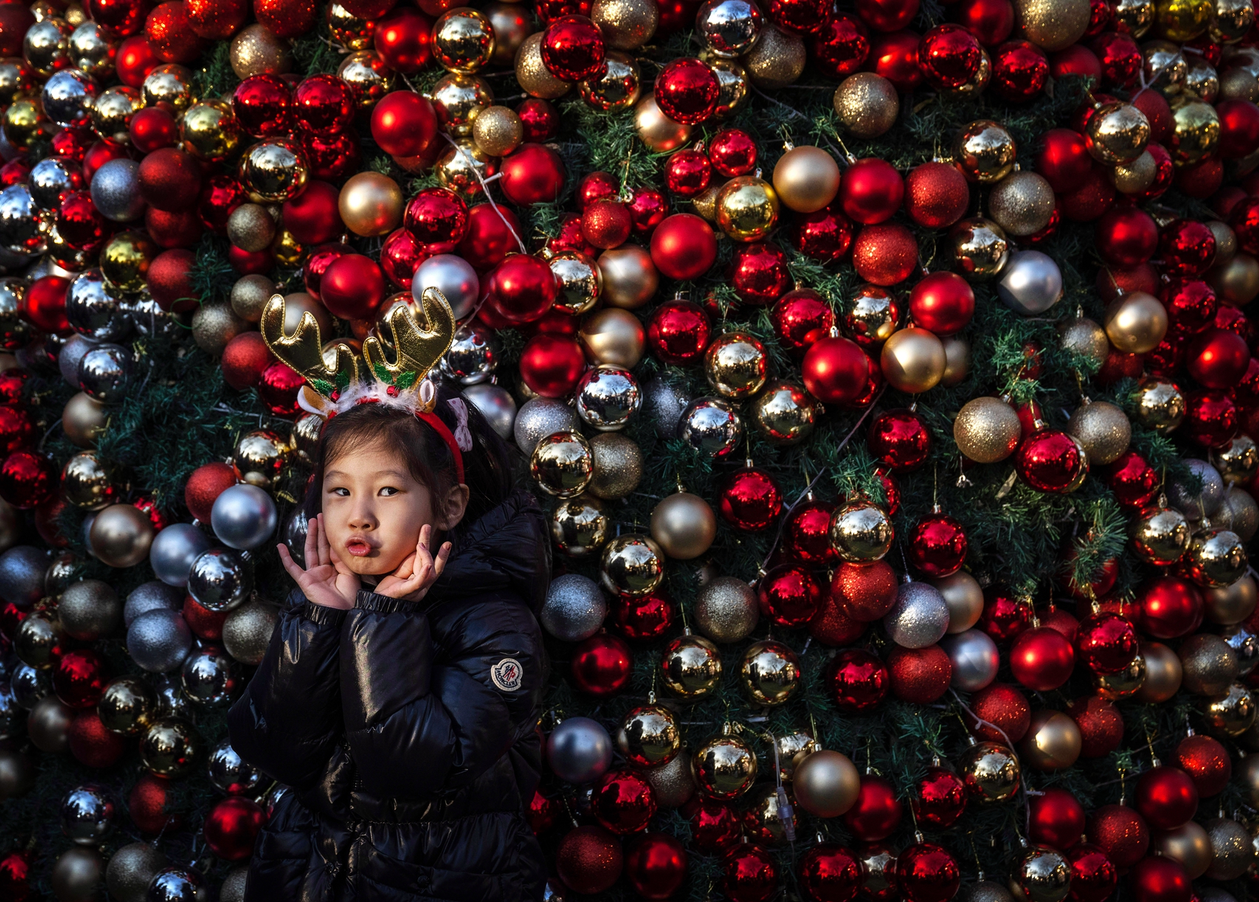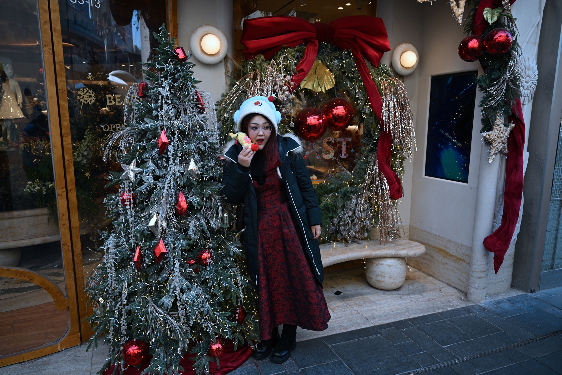 2025年12月21日,一个戴着节日头饰的小女孩在北京一处圣诞市集的圣诞树前摆姿势拍照。(Kevin Frayer/Getty Images)2025年12月14日,一名女子在北京一家购物中心的圣诞树旁摆姿势拍照。(Pedro Pardo/AFP via Getty Images)