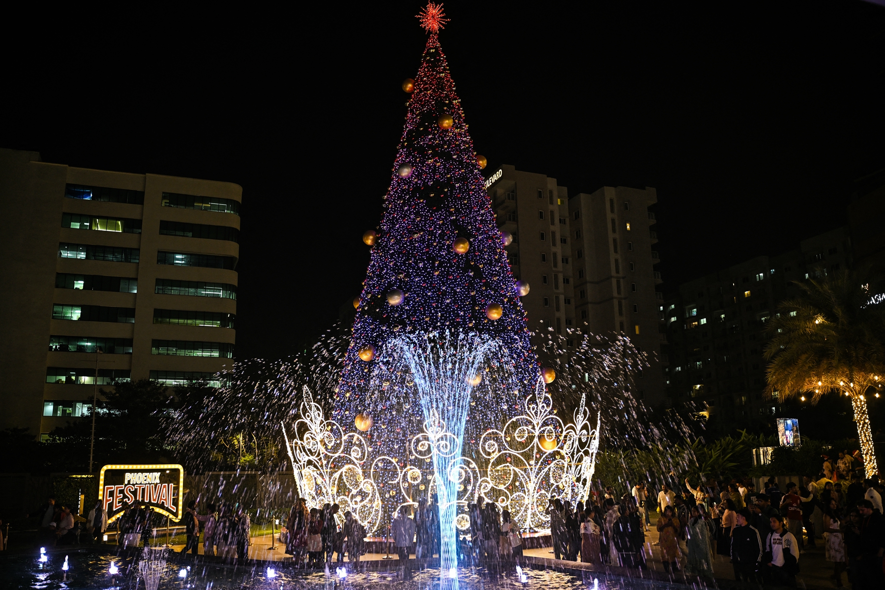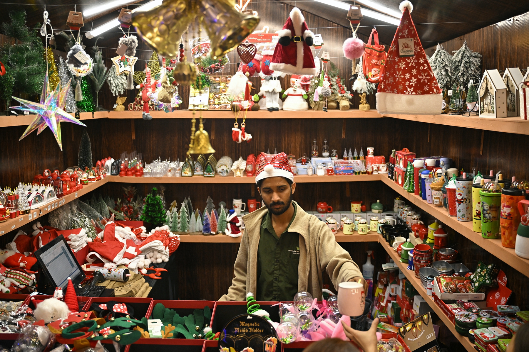 2025年12月23日,大批民众聚集在班加罗尔亚洲凤凰购物中心一棵被点亮的圣诞树周围,享受节日时光。(Idrees Mohammed/AFP via Getty Images)2025年12月23日,一名男子在班加罗尔亚洲凤凰购物中心内的圣诞市场出售装饰品。(Idrees Mohammed/AFP via Getty Images)
