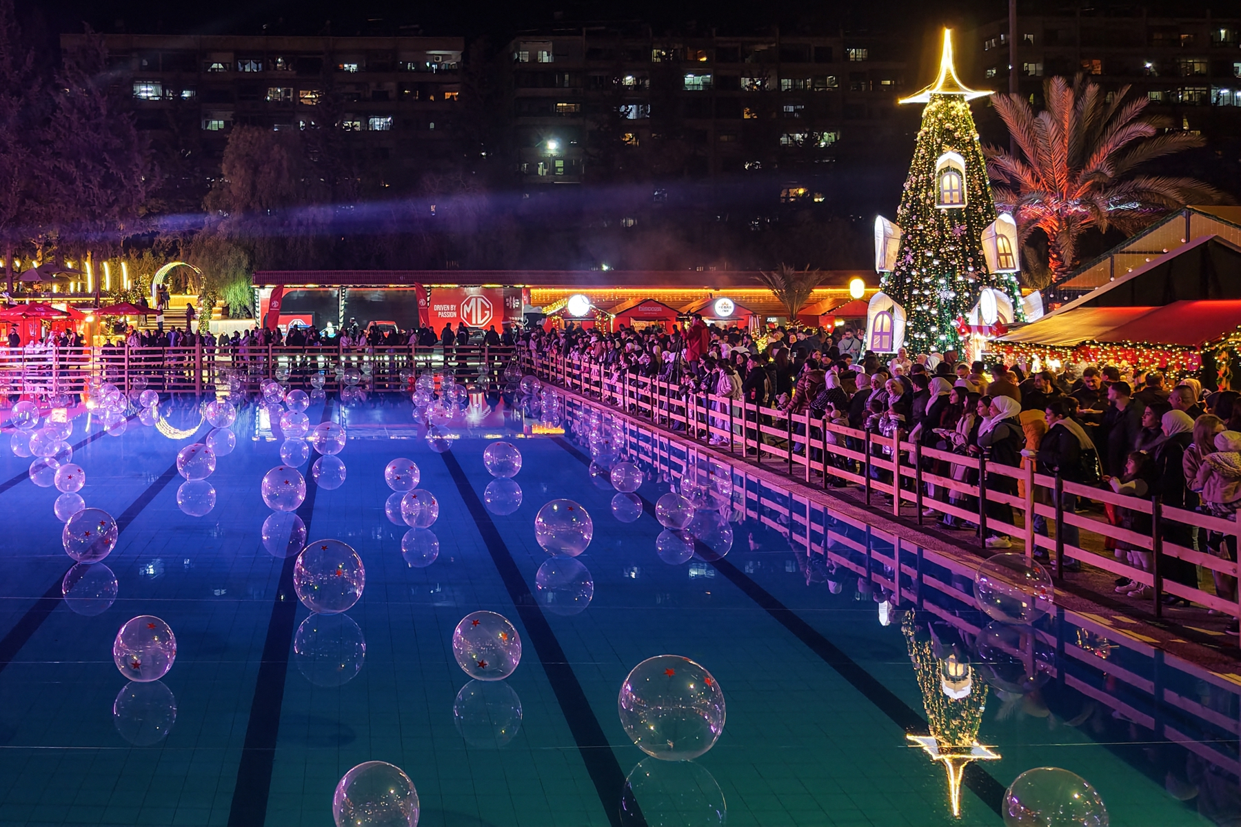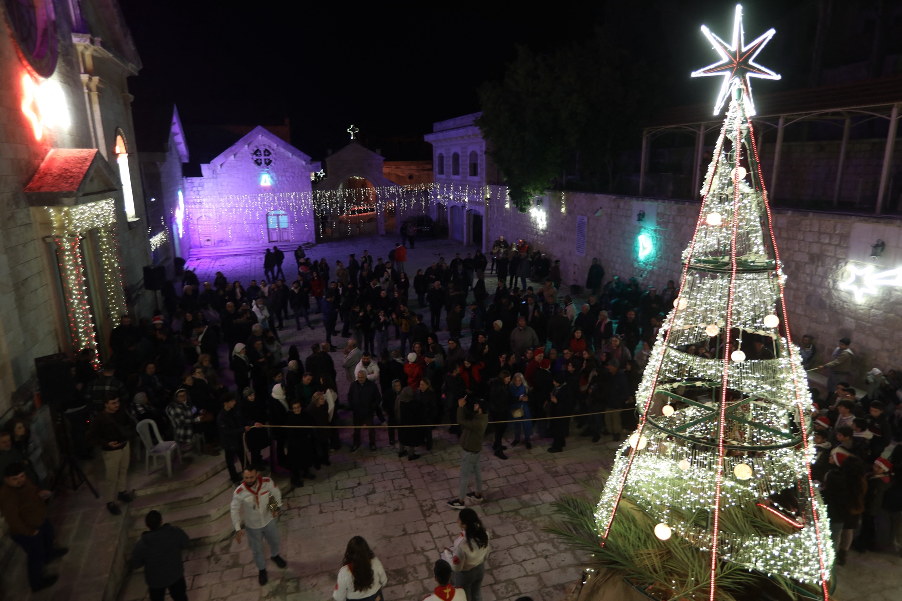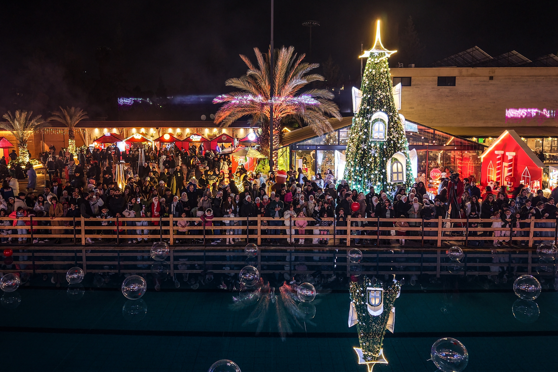 2025年12月22日,圣诞节前夕,大批民众在叙利亚首都大马士革一处游泳池周围设立的圣诞市集游逛。(Bakr Alkasem/AFP via Getty Images)2025年12月22日,圣诞节前夕,大批民众在叙利亚首都大马士革一处游泳池周围设立的圣诞市集游逛。(Bakr ALkasem/AFP via Getty Images)2025年12月20日,在叙利亚西北部伊德利卜省(Idlib)一个大多信仰基督教的村庄,村民们聚集在一棵被点亮的圣诞树周围,享受节日乐趣。(Omar Haj Kadour/AFP via Getty Images)