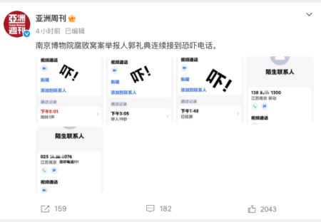 12月24日,《亚洲周刊》在其官方微博中透露,“南京博物院腐败窝案举报人郭礼典连续接到恐吓电话。”