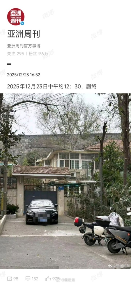 “扎西德勒‧天珠收藏”说,“事实上,《亚洲周刊》早在12月23日下午近5点时,就已发布过一条耐人寻味的微博。这条微博配文‘2025年12月23日中午约12:30,剧终’,并附上了一张徐湖平别墅的照片。值得关注的是,这套别墅距离南京博物院非常近,且本身还是一处受国家保护的文物建筑。照片中,别墅门前停放着一辆黑色小轿车,这张图片与简短的配文当时便引发了网友的诸多猜测,有人推测这辆车是政府部门的办案车辆,也有不少人疑惑,难道是徐湖平因身体原因被送往医院?如今结合邻居的爆料来看,这场‘剧终’所指向的,显然是调查行动的正式启动。”