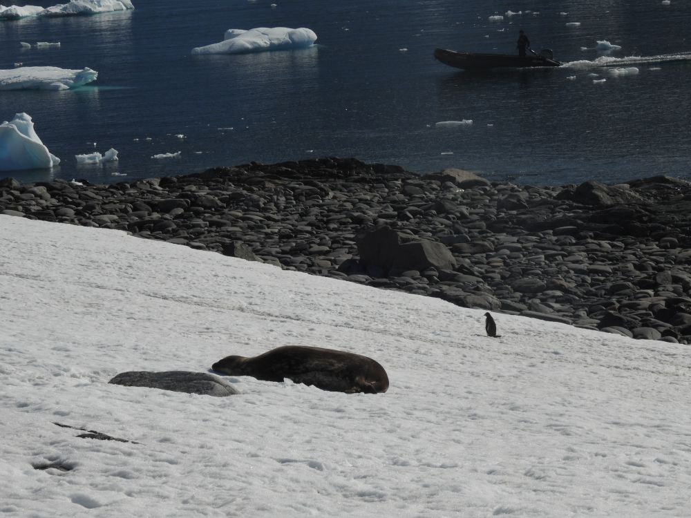 人,企鹅和海豹。中间像大石头的就是海豹。我觉得海豹是南极最无趣的动物,因为绝大多数时候都在睡觉。只要你不是离他太近,人家连眼睛都懒得睁开。