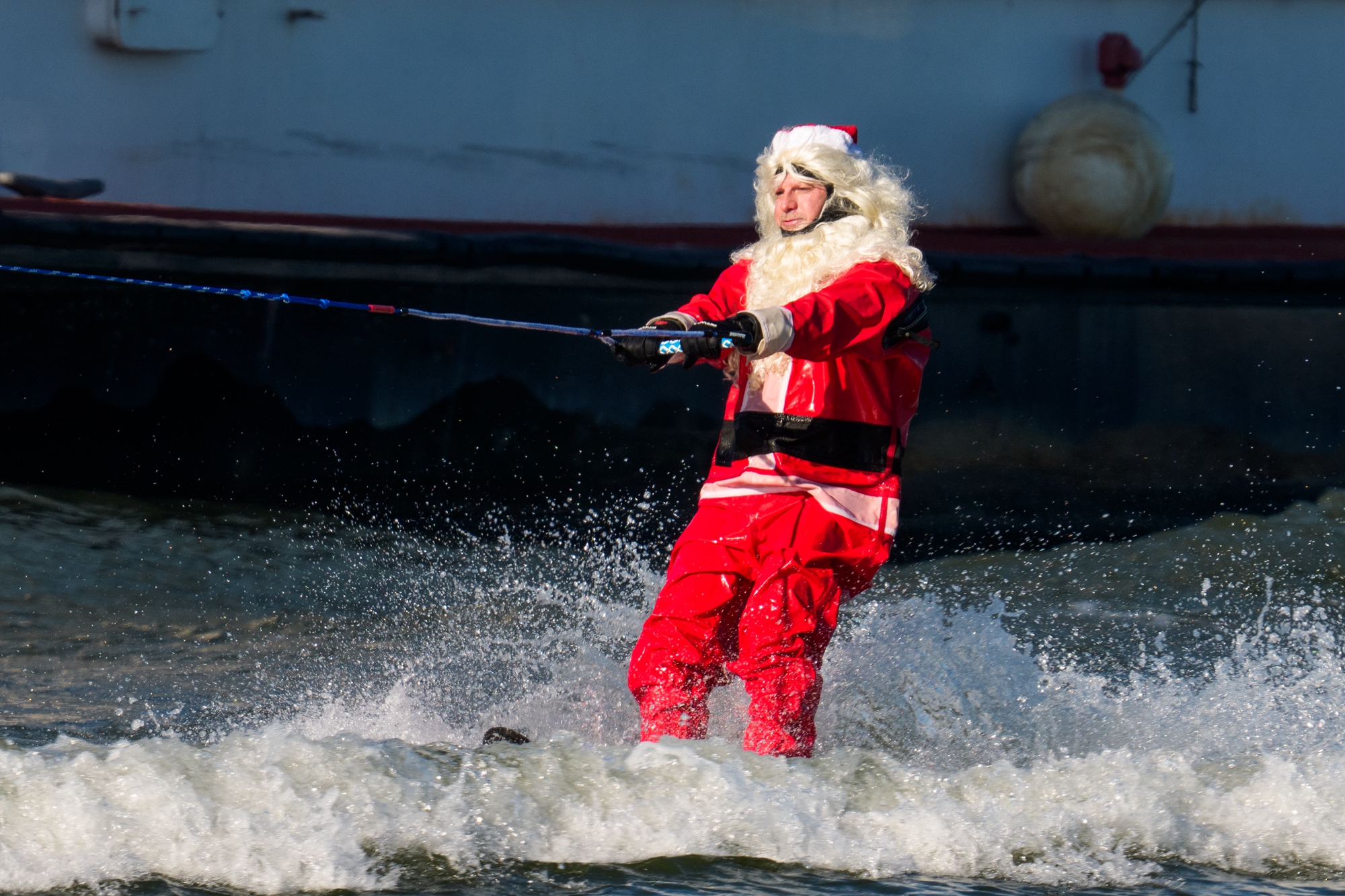 在平安夜(12月24日)这天,美国弗吉尼亚州亚历山大老城举办了一场别开生面的圣诞老人滑水活动,吸引大批游客和民众聚集在岸边观看,场面异常壮观。