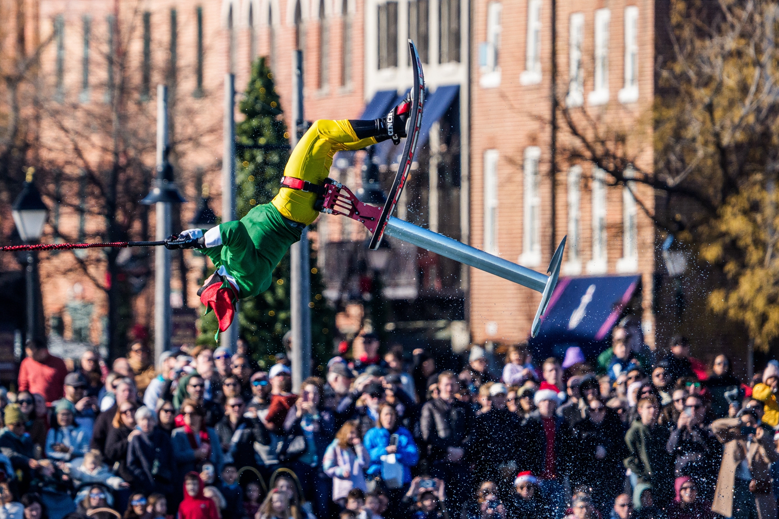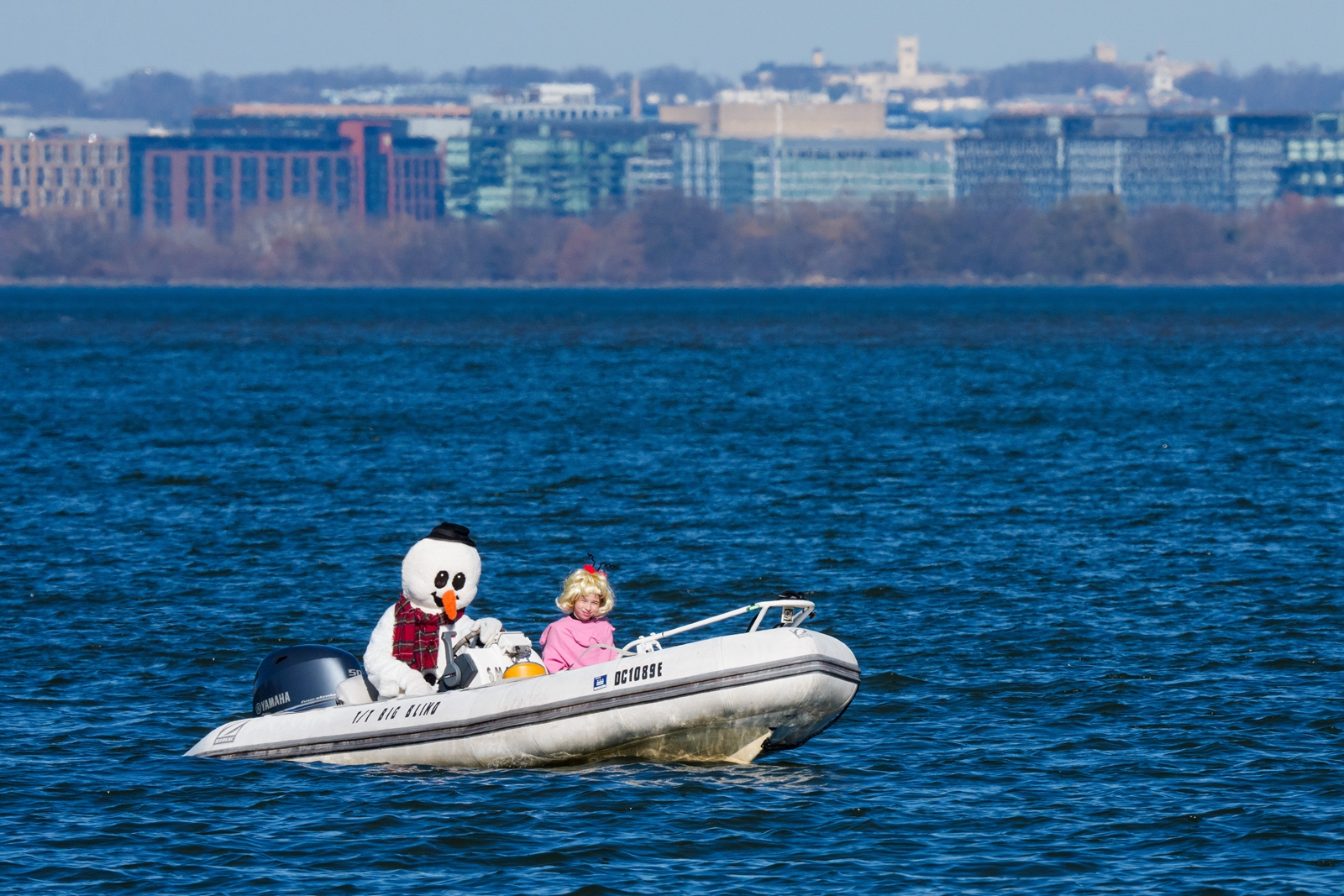 当天下午,人群聚集在亚历山大老城(Alexandria Old Town)的波托马克河(Potomac)岸边,大家都翘首以待。终于,圣诞老人带着他的驯鹿和小精灵们出现了,其中还混迹着一个专门搞破坏的绿毛怪格林奇。