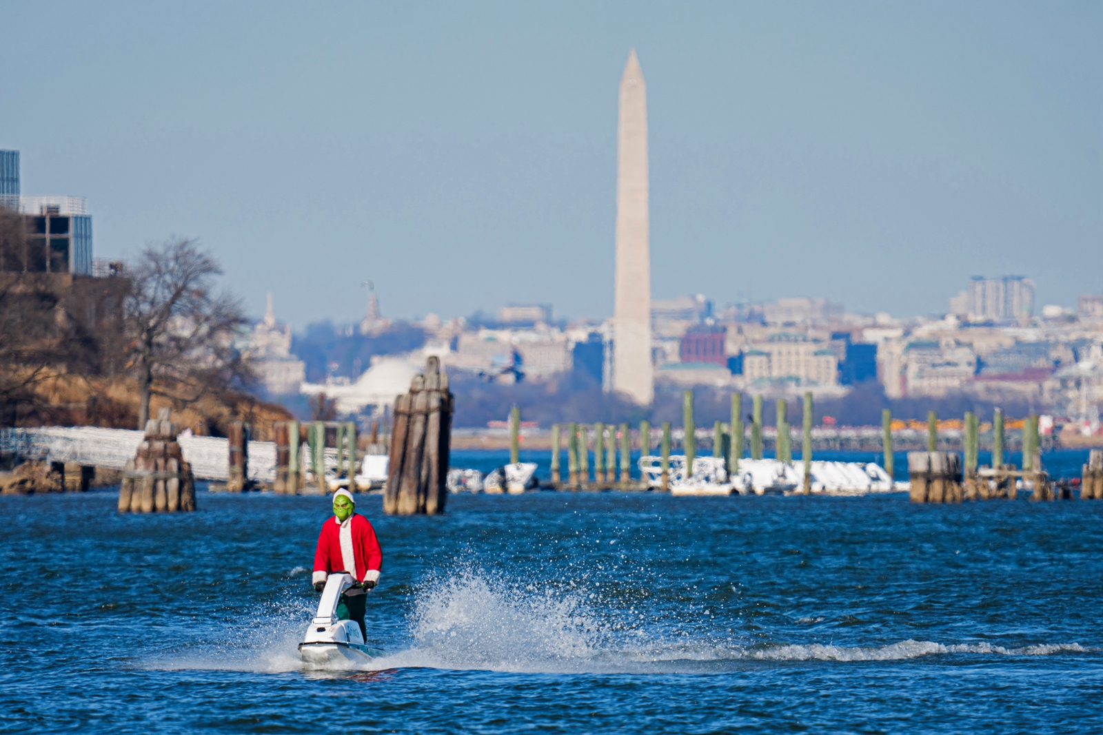 2025年12月24日平安夜,在美国弗吉尼亚州亚历山大老城举行的圣诞老人滑水活动中,一个装扮成绿毛怪格林奇的人独自驾驶一艘摩托艇。(Aaron Schwartz/Getty Images)