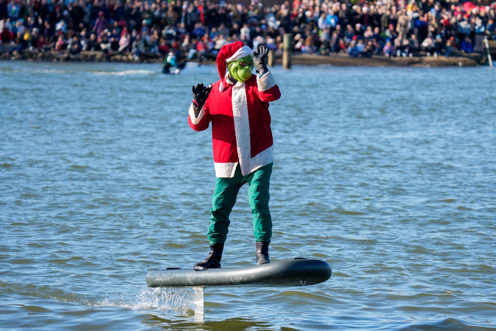 2025年12月24日平安夜,在美国弗吉尼亚州亚历山大老城举行的圣诞老人滑水活动中,一个装扮成绿毛怪格林奇的人进行滑水表演。(Aaron Schwartz/Getty Images)2025年12月24日平安夜,在美国弗吉尼亚州亚历山大老城举行的圣诞老人滑水活动中,一名装扮成圣诞小精灵的滑水爱好者展示高难度动作。(Aaron Schwartz/Getty Images)