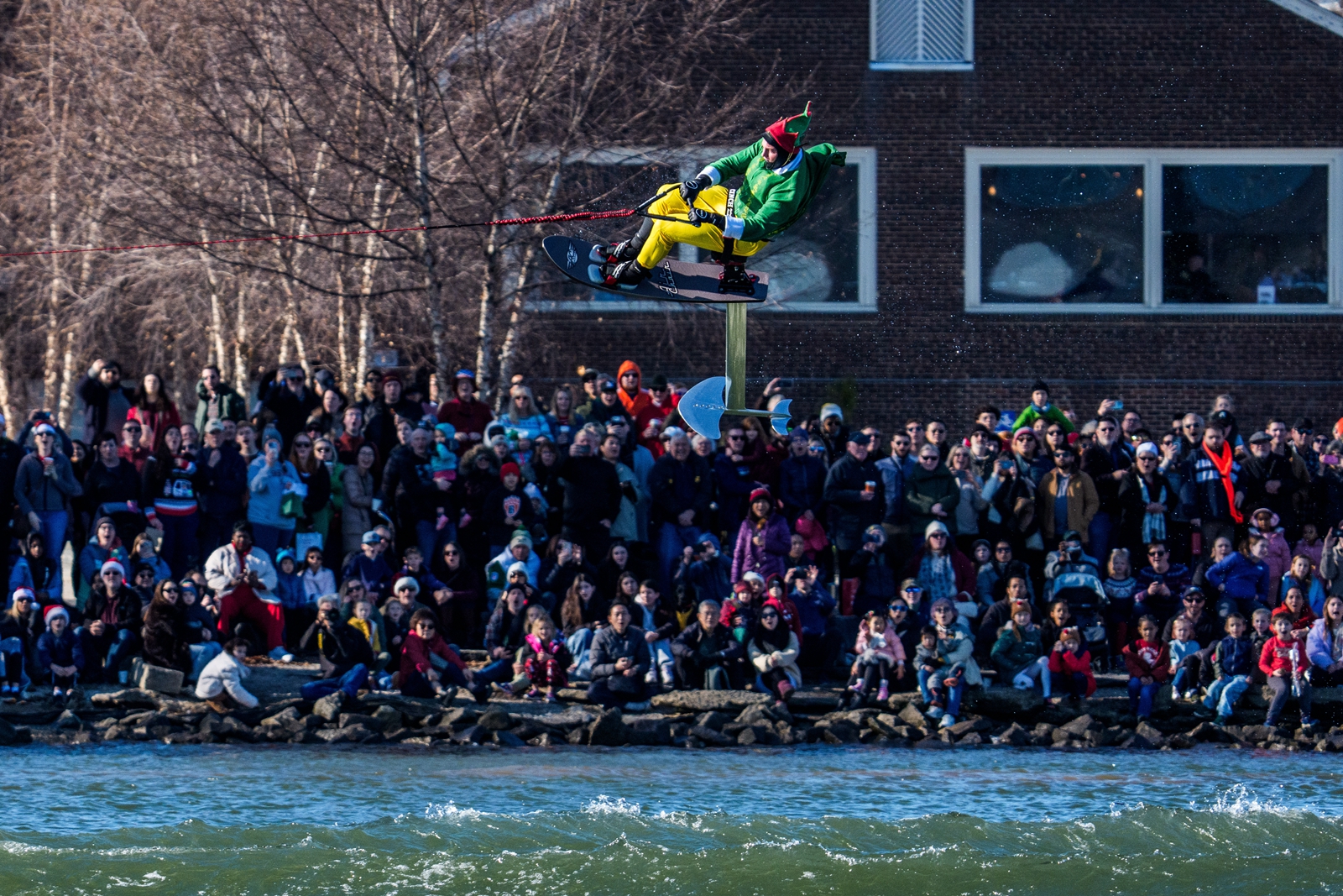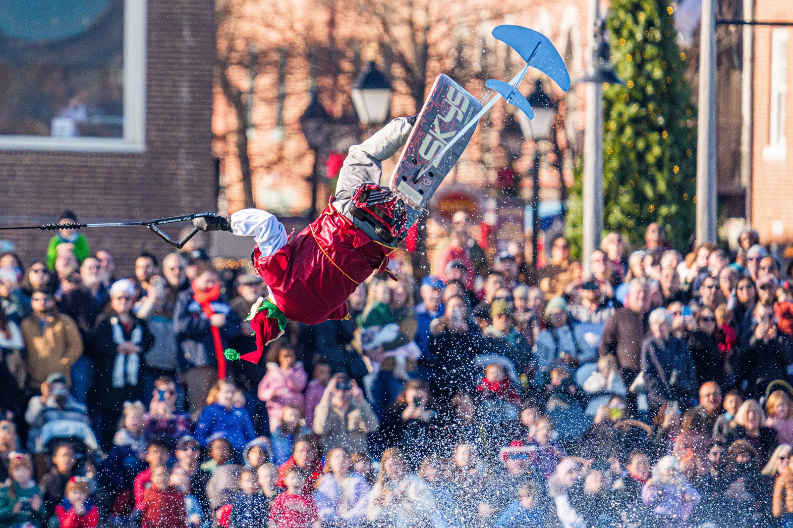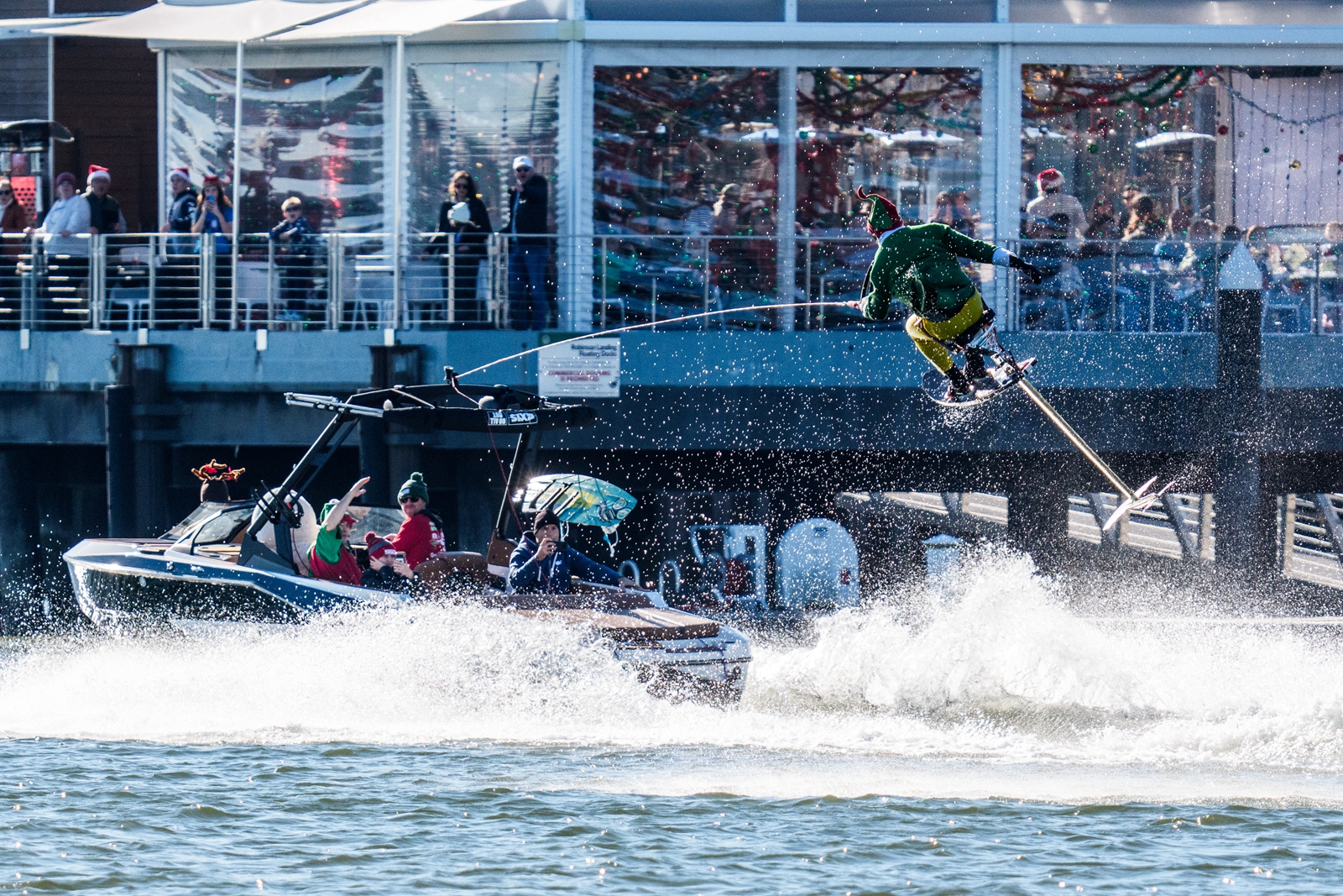 2025年12月24日平安夜,在美国弗吉尼亚州亚历山大老城举行的圣诞老人滑水活动中,一名装扮成圣诞小精灵的滑水爱好者展示高难度动作。(Aaron Schwartz/Getty Images)