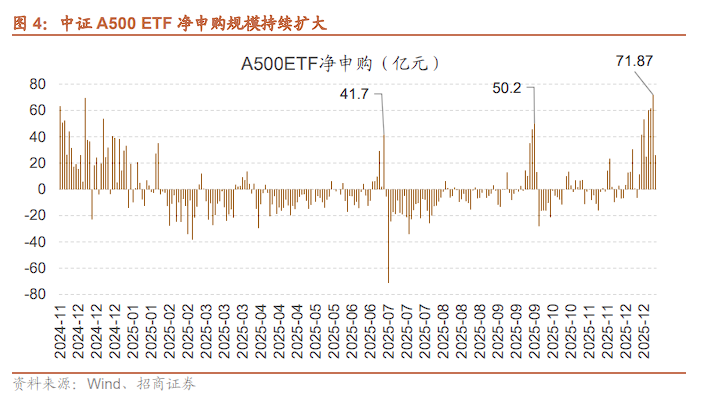 12月份以来,A500ETF出现明显净申购,单日申购金额达到71亿元的历史最高水平,通过该产品流入A股的资金体量约超过400亿元。