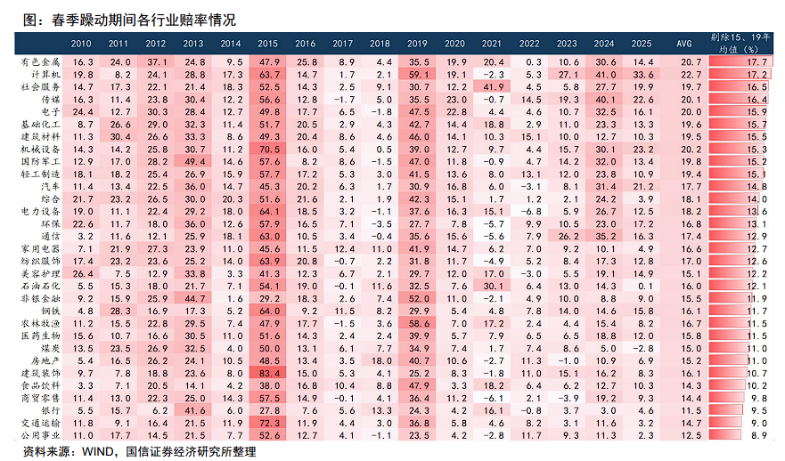 尽管乐观情绪升温,但行情启动的时点与强度仍是市场必注的焦点。国信证券的复盘研究显示,A股春季躁动行情近年抢跑特征明显,主涨段覆盖春节至两会期间概率最高,其中有色金属、计算机、电子等行业历史赔率占优。报告指出,在分子端不弱、流动性改善且外部冲击有限的条件下,今年春季躁动大概率不会太弱,且呈现全球股市共振特征。