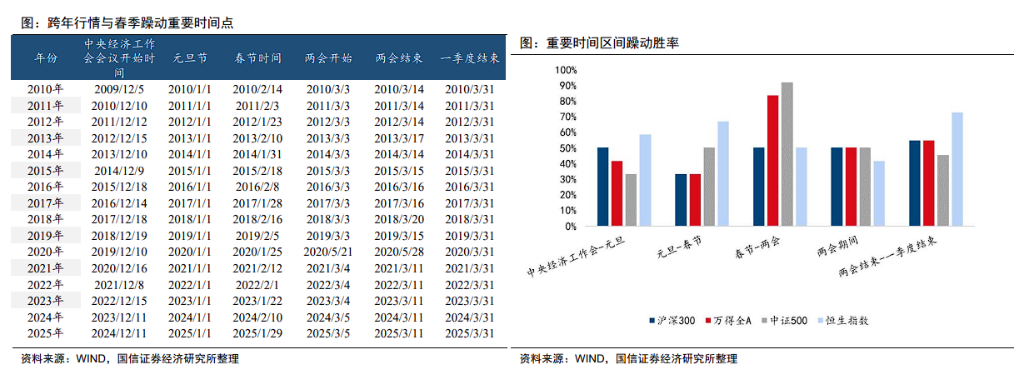 国信证券研判,岁末年初的上涨行情多受政策催化驱动,近年来有明显抢跑特征。2017年后仅有2019、2024、2025年春季躁动在跨年后开启,而2017年以前仅有2013、2015年提前于跨年前启动。当前市场处于全年与基本面最脱敏的交易窗口。